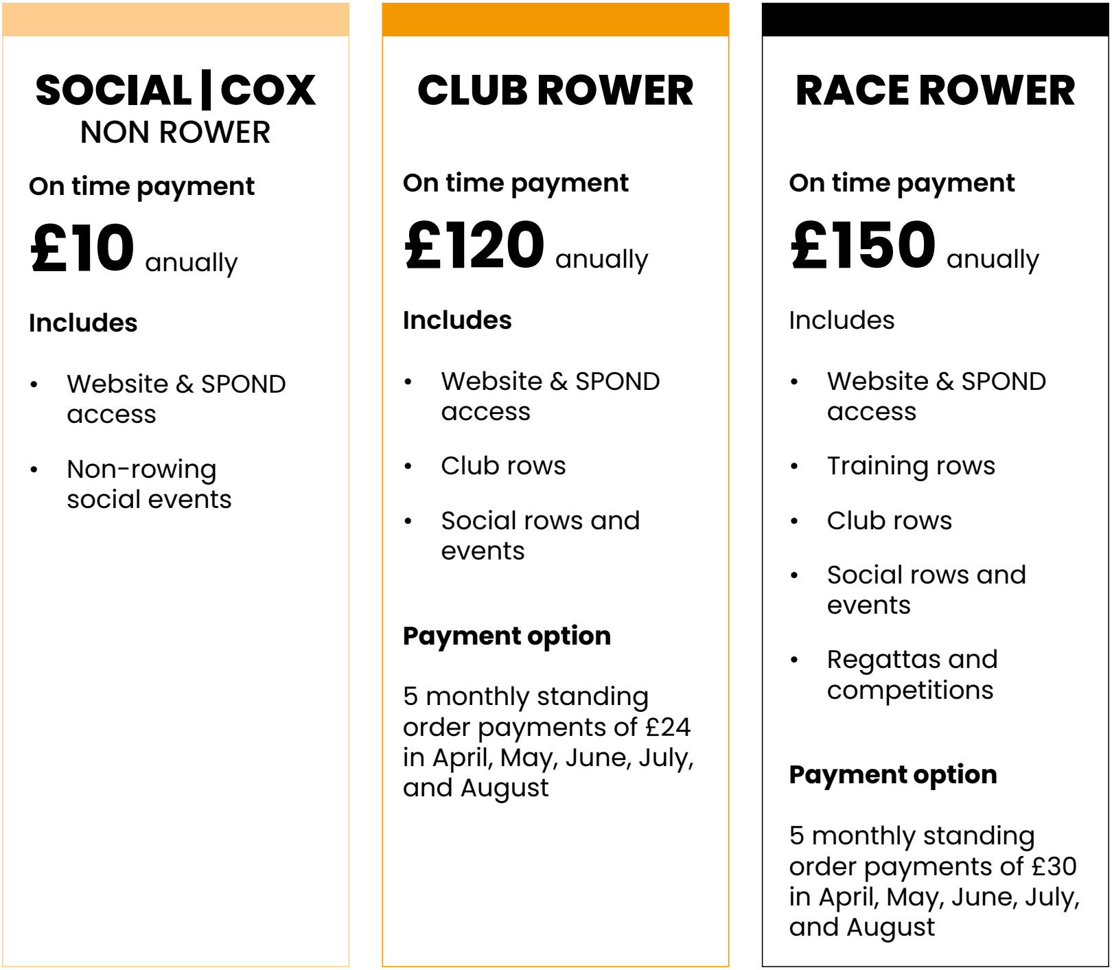 You may choose to spread your payment across 5x equal payments by setting up a standing order. This option is not available for Non-Rowing / Cox ONLY memberships.